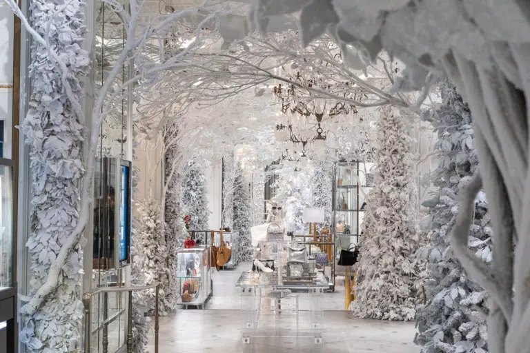 Dentro da loja, uma terra de maravilhas de inverno aguarda, com joias luxuosas, bolsas e roupas exibidas em um ambiente branco lúdico, com pássaros da floresta “voando” acima e árvores cobertas de neve ao longo dos corredores — uma visão de tirar o fôlego.