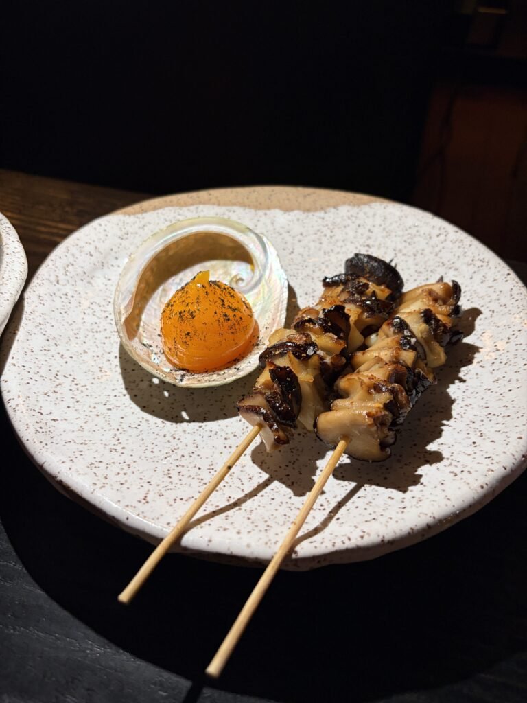 Se tiver a chance, não deixe de pedir o arroz com amêijoas quahog ($26) e os espetos de abalone com shiitake e gema de ovo ($32). O toque defumado dos espetos harmoniza perfeitamente com o arroz cremoso e rico. Segundo um dos garçons, essa é uma combinação favorita da cozinha.