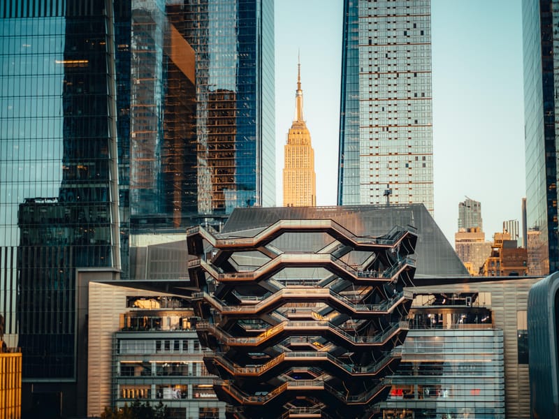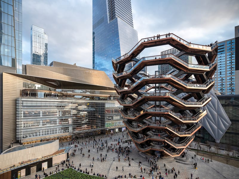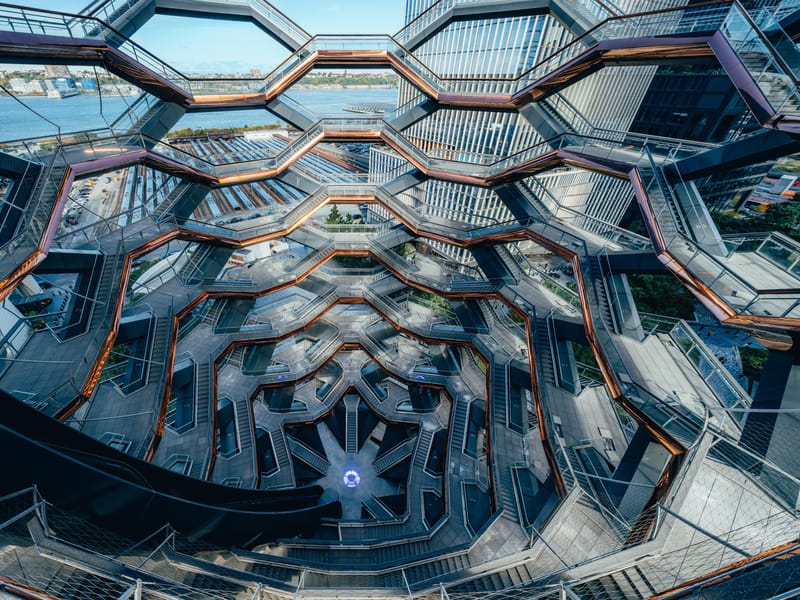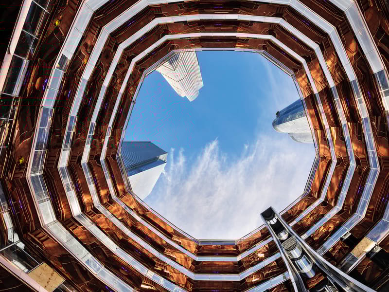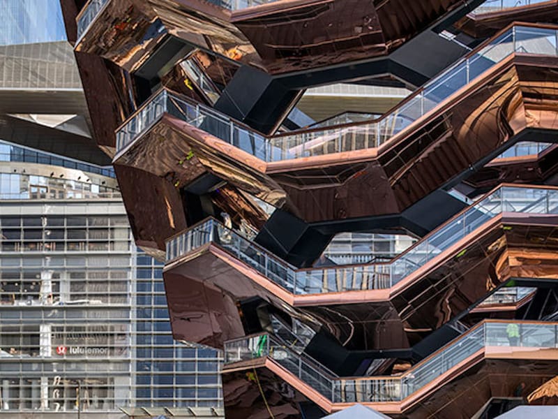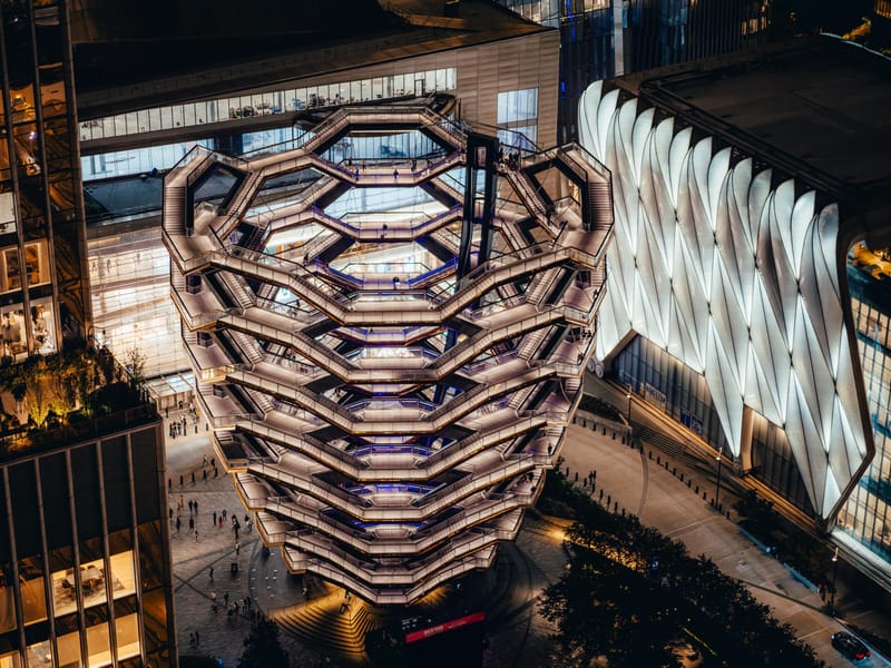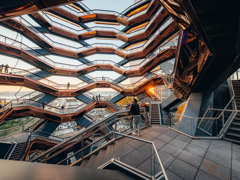 O que você vai ver: Ao subir as escadas do Vessel, você será cercado por uma estética impressionante. As escadas revestidas em cobre altamente reflexivo criam um efeito visual incrível, perfeito para capturas de Instagram. A cada degrau, você terá a chance de observar a cidade de diferentes ângulos, tornando cada subida uma nova descoberta. Não se esqueça de aproveitar para tirar fotos incríveis e registrar esses momentos mágicos.