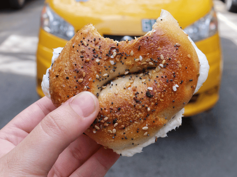 O ponto de encontro é em frente ao Bagel Bobs, localizado na 51 University Place.