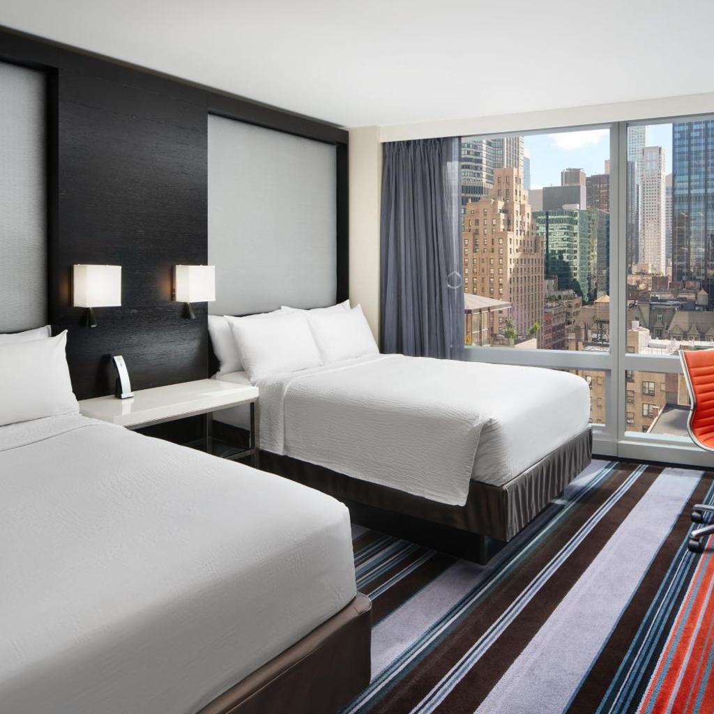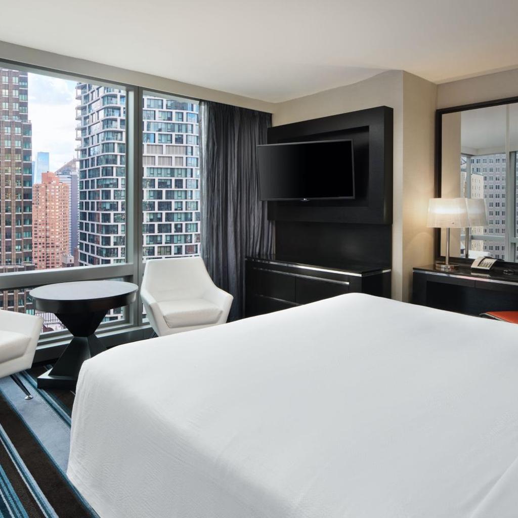 Os quartos do Courtyard by Marriott são um refúgio de tranquilidade e estilo. Cada acomodação é equipada com TV via satélite com canais a cabo, uma prática geladeira e uma mesa de trabalho, ideal para quem precisa de um espaço para se concentrar. As janelas panorâmicas oferecem vistas deslumbrantes, permitindo que você aprecie a vibrante cidade de Nova York, com opções que incluem vistas do Central Park, da Times Square ou do majestoso Rio Hudson.