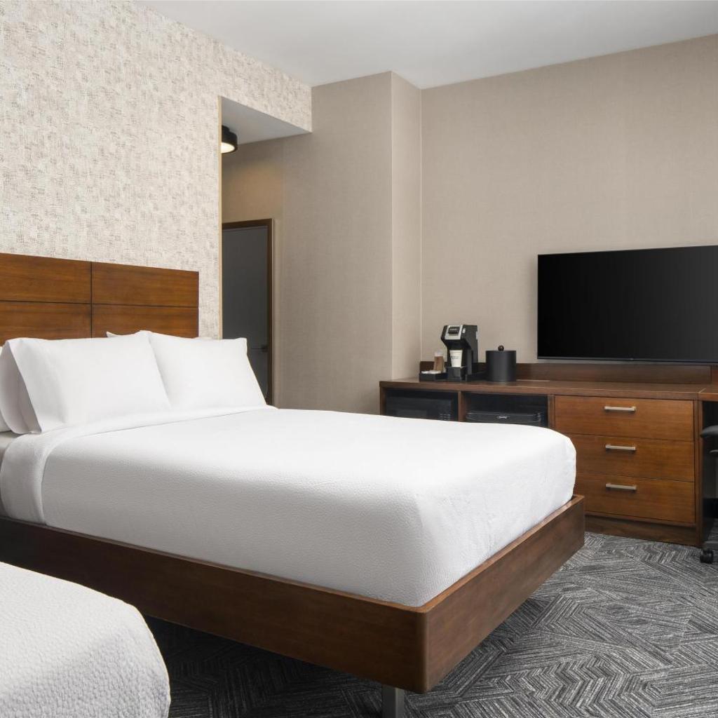 Os quartos do Hilton Garden Inn oferecem uma verdadeira experiência de hospedagem. Cada um dos quartos bem equipados conta com uma TV de tela plana a cabo, micro-ondas e geladeira, garantindo praticidade e conforto durante a sua estadia. O banheiro privativo, adornado com amenidades de banho gratuitas e secador de cabelo, proporciona um toque de elegância e funcionalidade. Alguns quartos oferecem vistas deslumbrantes da cidade, permitindo que você acorde todos os dias com a icônica paisagem urbana de Nova York ao seu redor.