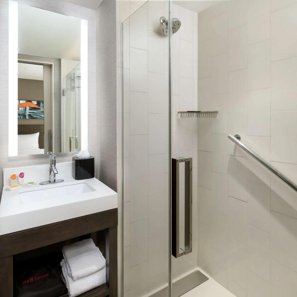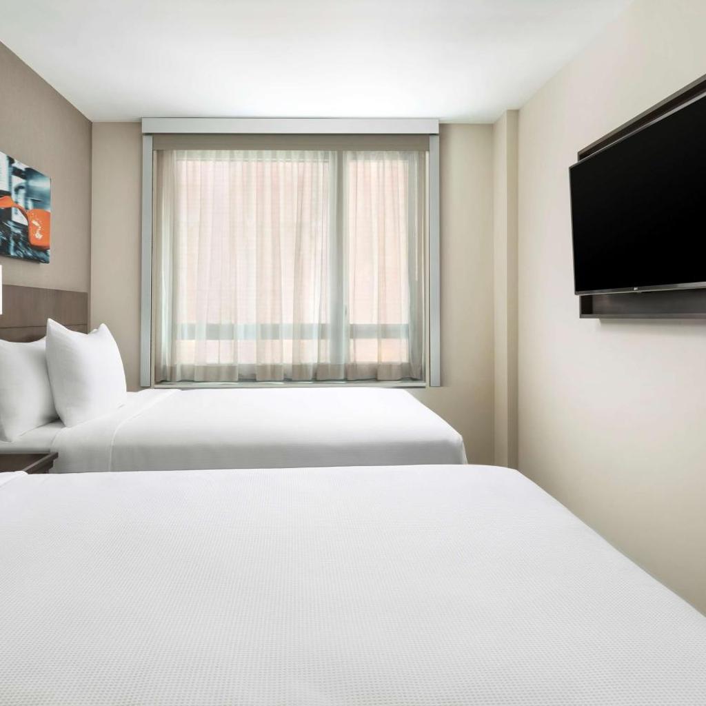 Os quartos são projetados com o conforto em mente, apresentando um guarda-roupa espaçoso e banheiros privativos que incluem chuveiro, secador de cabelo e amenidades de banho de cortesia. O ambiente é ideal tanto para viajantes a negócios quanto para turistas que desejam aproveitar a energia de Nova York.