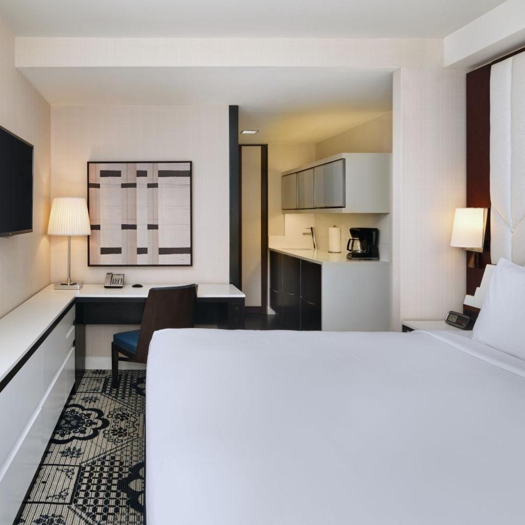 Os quartos do Residence Inn foram projetados para proporcionar o máximo de conforto e praticidade. Cada unidade é equipada com uma cozinha compacta, perfeita para preparar suas próprias refeições após um dia explorando a cidade. Para sua conveniência, todos os quartos incluem uma base para iPod, TV de tela plana a cabo e um banheiro privativo. Se você estiver buscando uma vista de tirar o fôlego, alguns quartos oferecem panoramas deslumbrantes da cidade, do Central Park, do rio Hudson ou até mesmo da iluminada Times Square.
