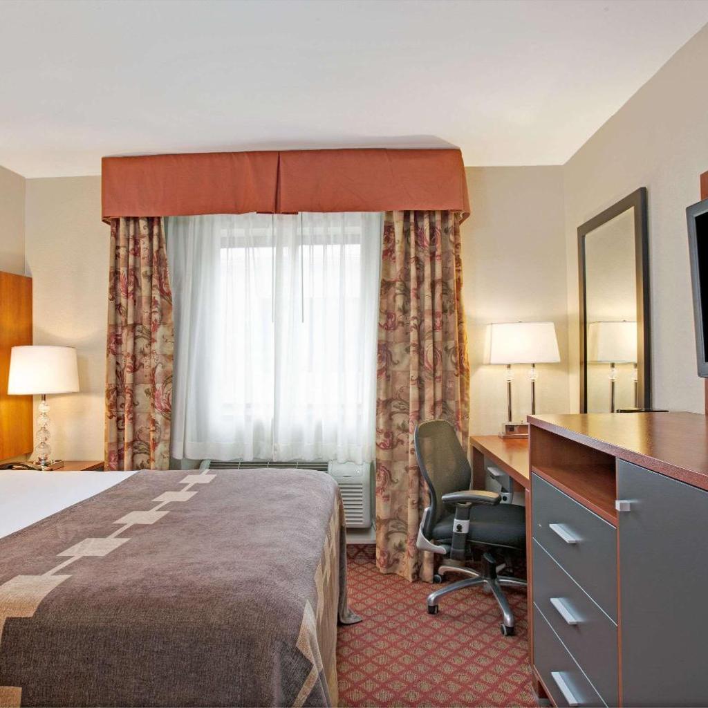 Ao fazer check-in no Ramada by Wyndham, você será recebido em um ambiente acolhedor e amigável. Cada um dos nossos quartos foi projetado para proporcionar o máximo de conforto, com ar-condicionado para os dias quentes de verão e Wi-Fi gratuito para que você possa se manter conectado. As comodidades incluem chamadas telefônicas locais gratuitas, garantindo que você possa entrar em contato com amigos e familiares sem se preocupar com custos adicionais.